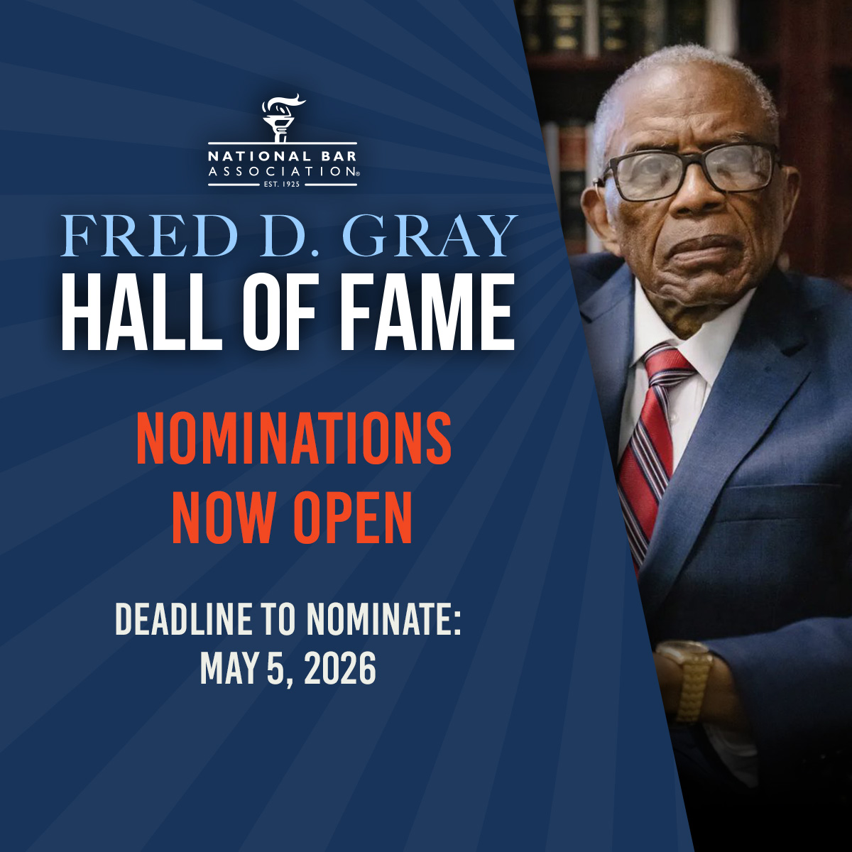 The National Bar Association is thrilled to announce that nominations are NOW OPEN for the Fred D. Gray Hall of Fame—one of the most prestigious honors bestowed by the NBA! As we mark 101 years of excellence in advocacy, justice, and service, we invite you to submit nominations for legal trailblazers who have made a lasting impact in the profession, in their communities, and in our collective fight for civil rights.